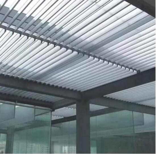 從結(jié)構(gòu)上講歐式百葉的葉片可翻轉(zhuǎn)調(diào)整角度,集百葉簾和天蓬簾的功能于一體,具有調(diào)光、遮陽、保溫、隔熱等多種功能。被廣泛用于玻璃建筑頂面和外墻遮陽隔熱。